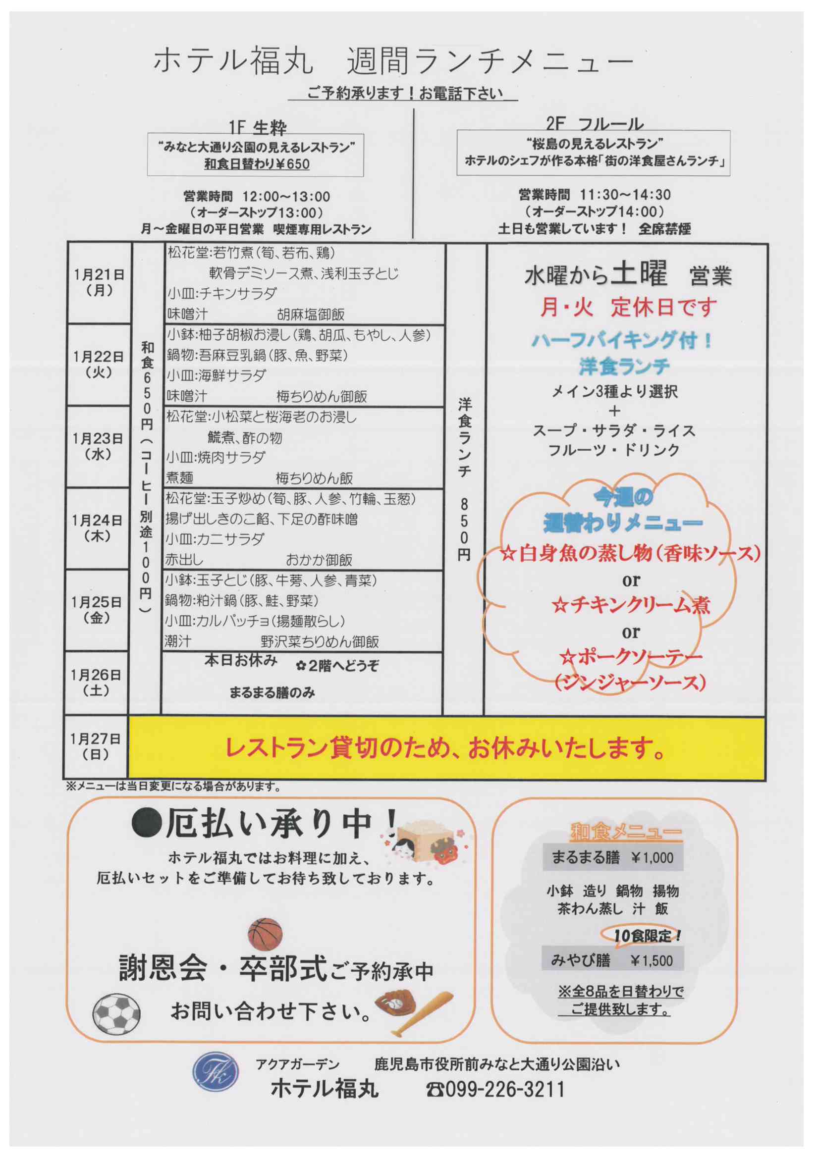 日曜日は貸切の為、和食・洋食ともにランチをお休みいたします。ご了承下さいませ。